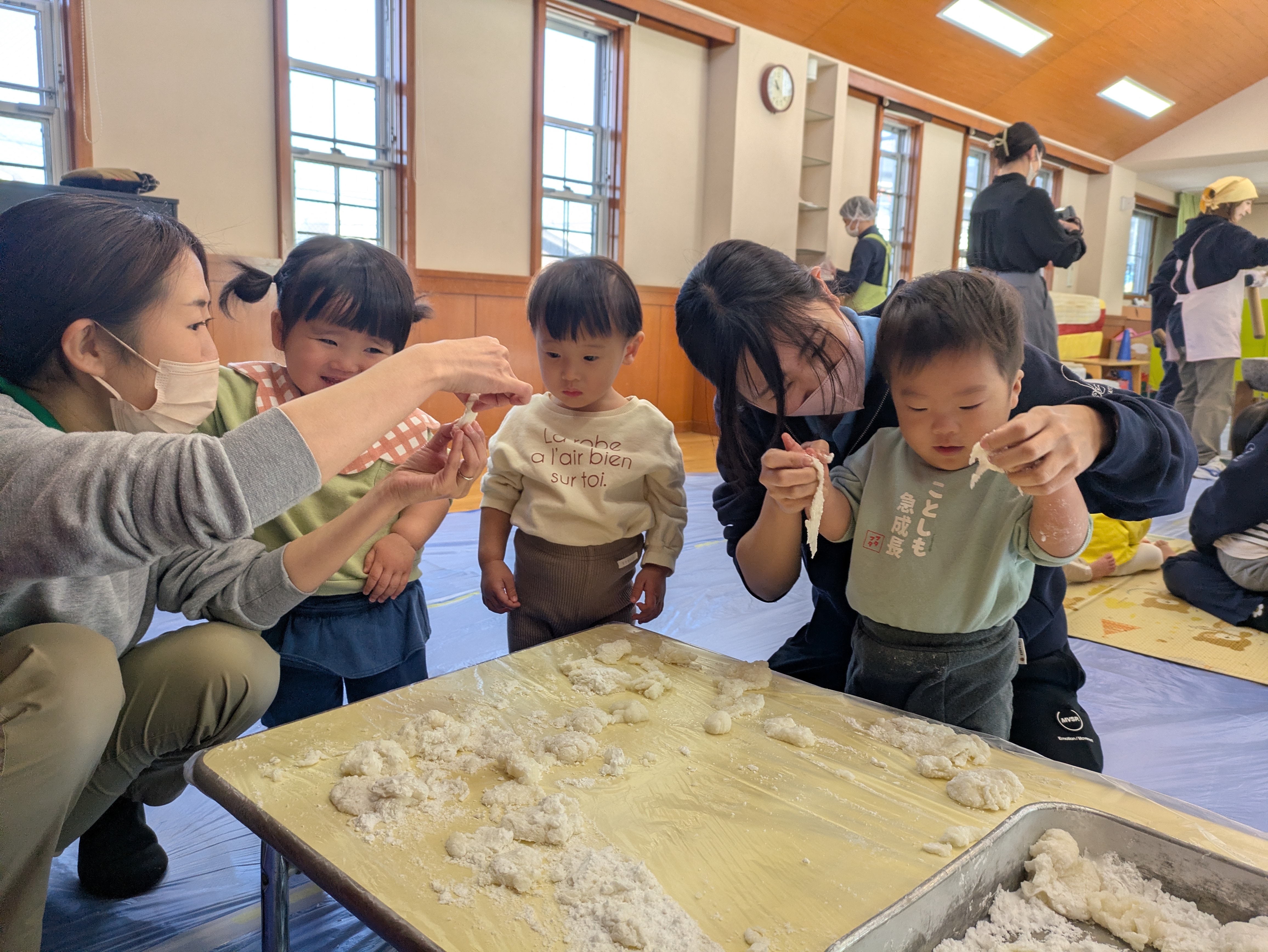 保育者や給食の先生がもち米をつくと「頑張れ!」と応援しながら「くっついてきた!」